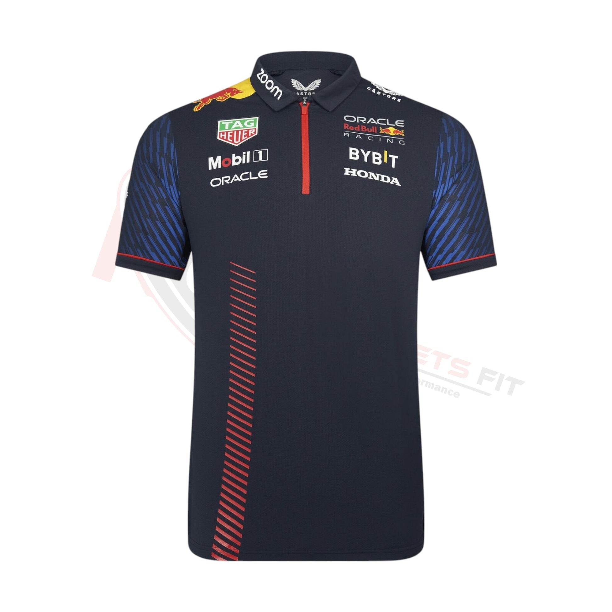 The Castore x Red Bull Racing 2023 Team Polo comes with the traditional collar, button placket, and short sleeves. The 2023 Polo showcases all the official team and sponsor logos as seen across the full Castore x Red Bull Racing Teamline range throughout the F1 season.