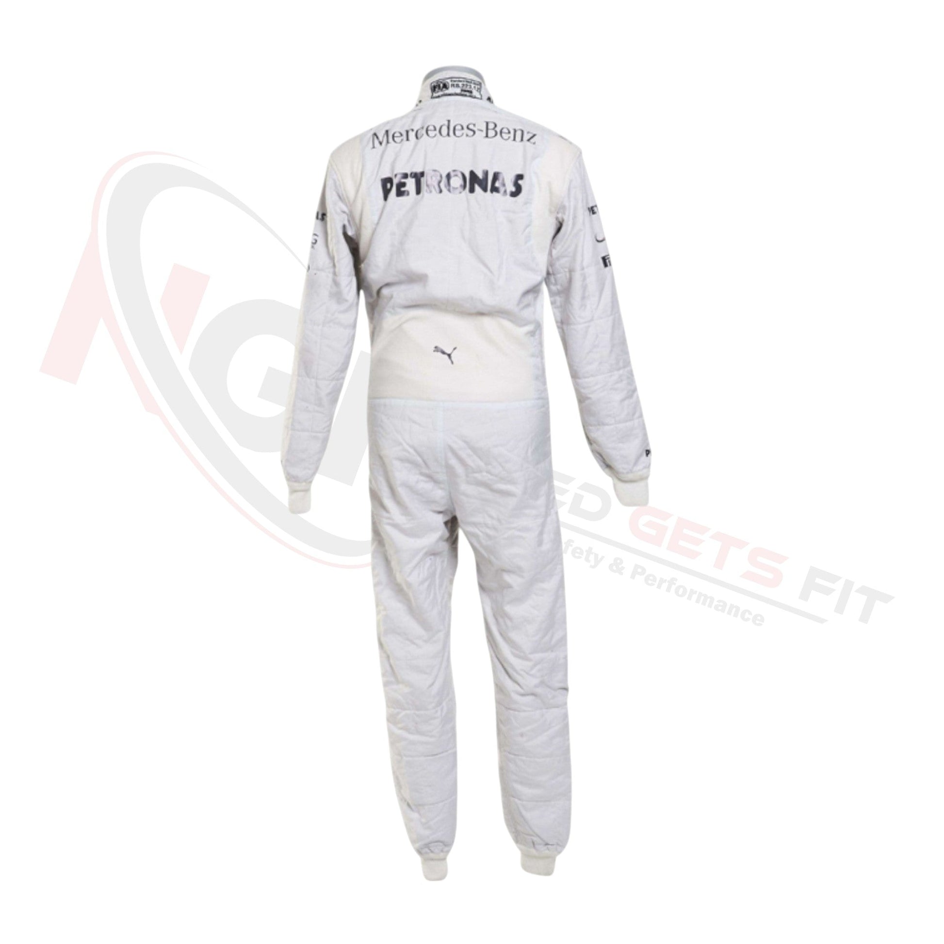 Further enhancing the suit’s visual appeal are the racing stripes adorning the front. These stripes not only pay homage to the dynamic design language of the Mercedes AMG Petronas F1 Team’s 2014 aesthetic but also add a touch of sportiness to the suit.